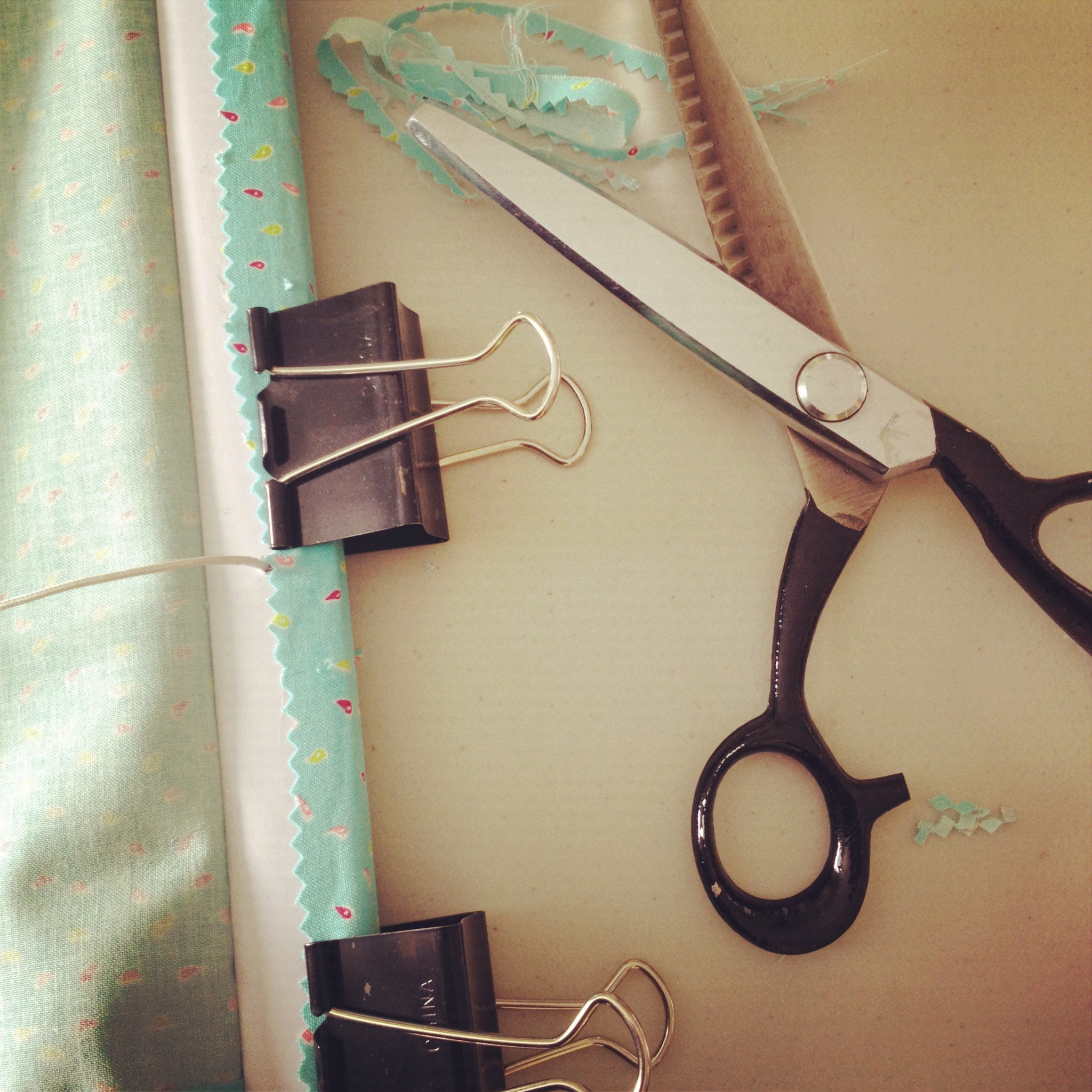 8. Trim: Using your fabric shears/scissors, trim the edge of the fabric to even it out a bit & get rid of any floppy edges. I started using a straight edge & rotary cutter on one side & soon realized it was silly so I eyeballed the rest. It will be hidden, after all!