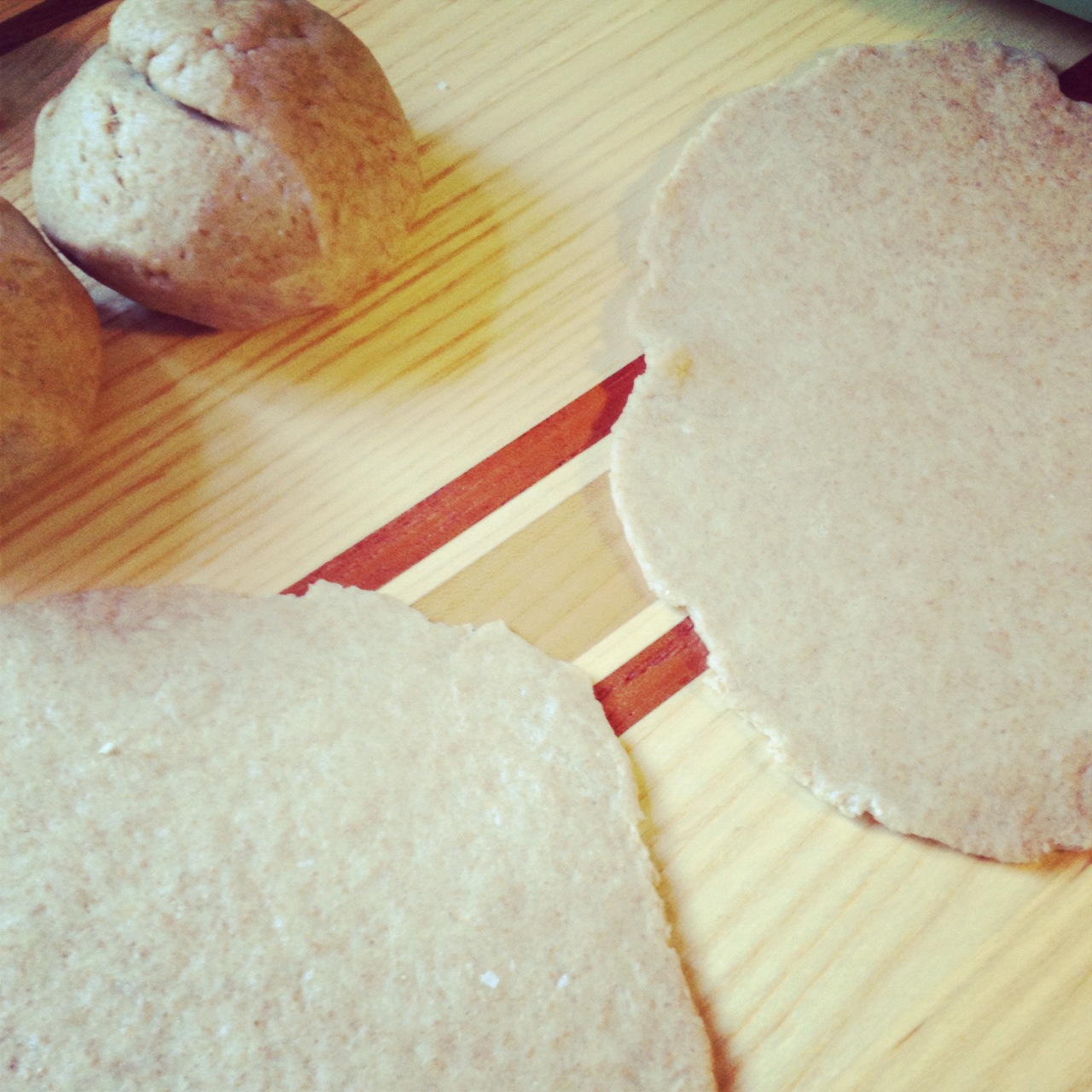 5. Using a rolling pin, flatten dough into 10 inch circles (mine were definitely NOT 10 inches — probably more like 8 but they were still nice & thin). Oh and they will not be perfect circles. That’s okay — we’re making something homemade so it’s nice if it looks rustic. That’s the beauty of it, people.