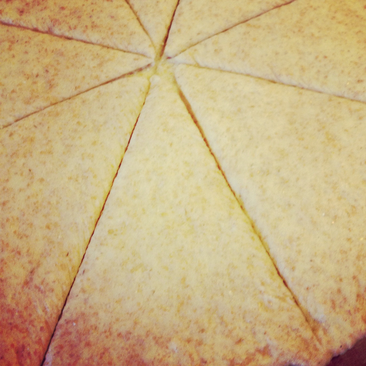 6. Place the circles of dough onto an ungreased cookie sheet or preheated pizza stone (I used the latter) & score each little round of dough to make little triangular pie slices. Scoring the dough isn’t as hard as it may sound — just use a really sharp knife & lightly drag it across the dough (be careful not to cut all the way through). See picture below.