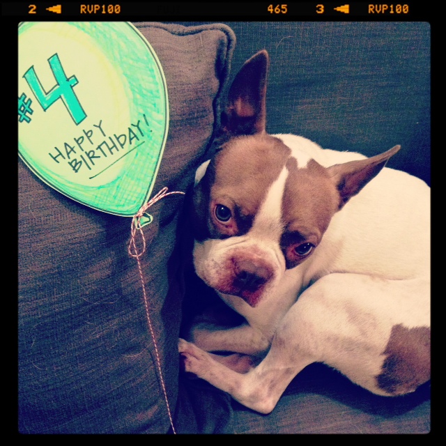 It is hard to believe that Ollie turned four yesterday. It seems like only yesterday I found a post on Petfinder about a tiny special needs Red Boston Terrier, named Brass Monkey, when in all reality is was in the Fall of 2009. Truth is, if a good Samaritan hadn’t found a Craigslist ad posted in Texas, by a puppy mill breeder then he wouldn’t be with us today. We love our little guy, and he has brought tons of laughs, kisses, and joy to more than just our tiny little family