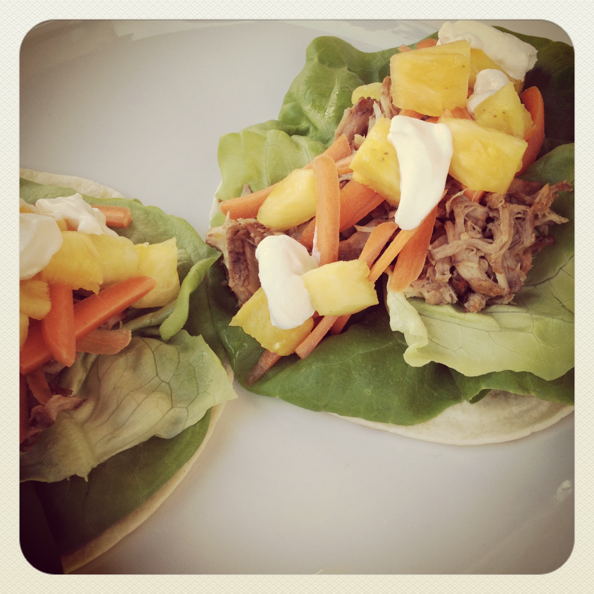 pulled pork (crockpot!), soft corn tacos, butter lettuce, fresh pineapple, fancy carrots, sour cream