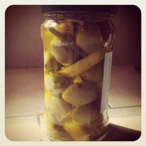10. Once the jar is filled, pour the olive oil into the jar filling it so the olives are covered in oil.